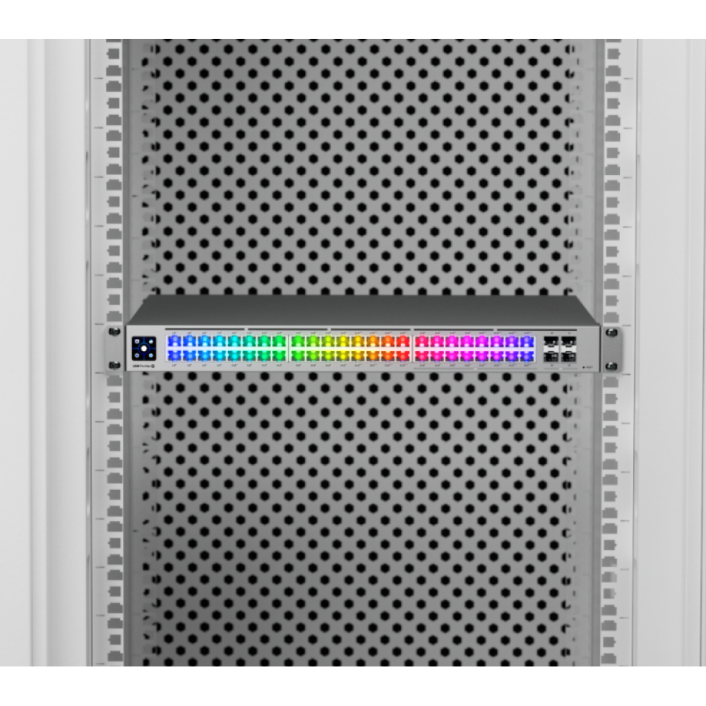 Коммутатор способен питать требовательные устройства, такие как точки доступа, IP-камеры и VoIP-телефоны, с мощностью до 60 Вт на порт PoE++. Подсвеченные порты Etherlighting облегчают идентификацию местоположения порта, скорости/соединения и сети VLAN. Работа устройства при отключении электроэнергии поддерживается за счет резервного питания постоянного тока. Управление и настройка коммутатора производятся через единый интерфейс Ubiquiti UniFi Network Controller.
